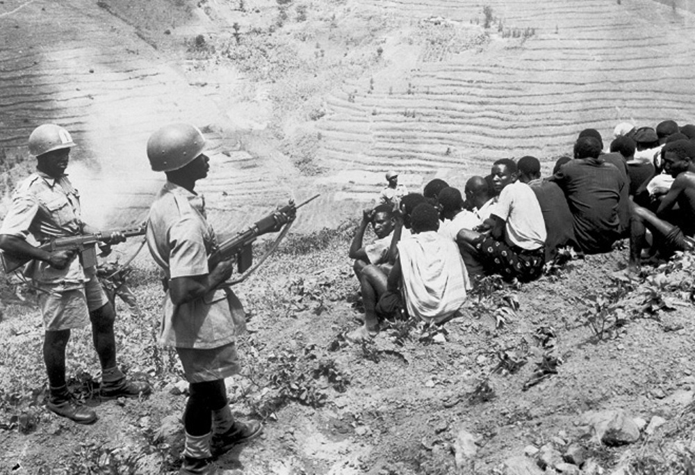 Members of Interahamwe during a march in 1990s. In 1992, violence against the Tutsis was concentrated in Kibuye prefecture.