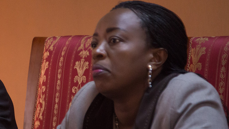 Miss Jolly Mutesi (C) asks a  contestant a question as Michelle Iradukunda (L) and Marie France Uwase (R) look on.