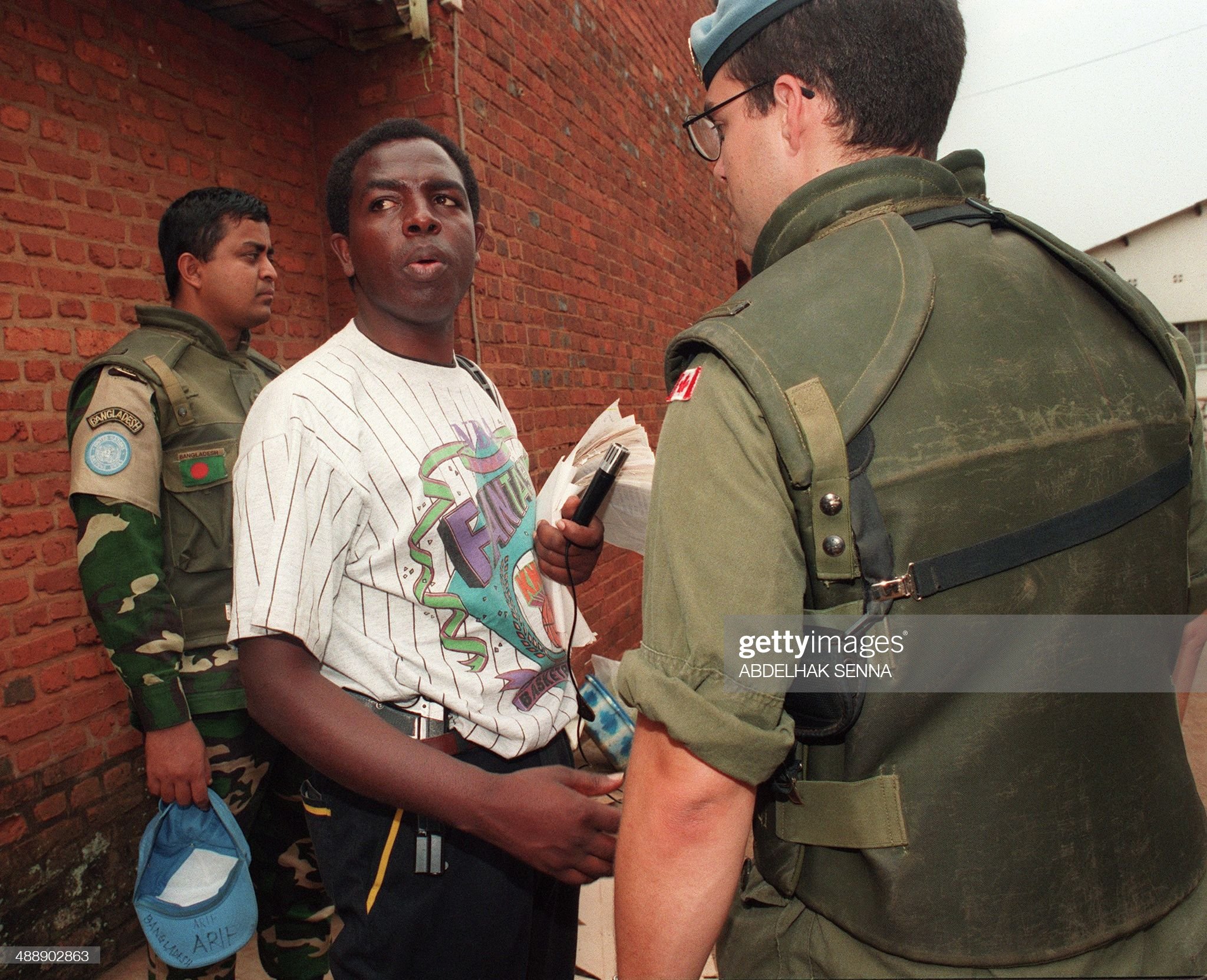 Munyeshyaka, (C) with a gun tucked under his belt. The priest openly moved with a gun throughout the Genocide against the Tutsi. (Photo courtesy of Getty Images)