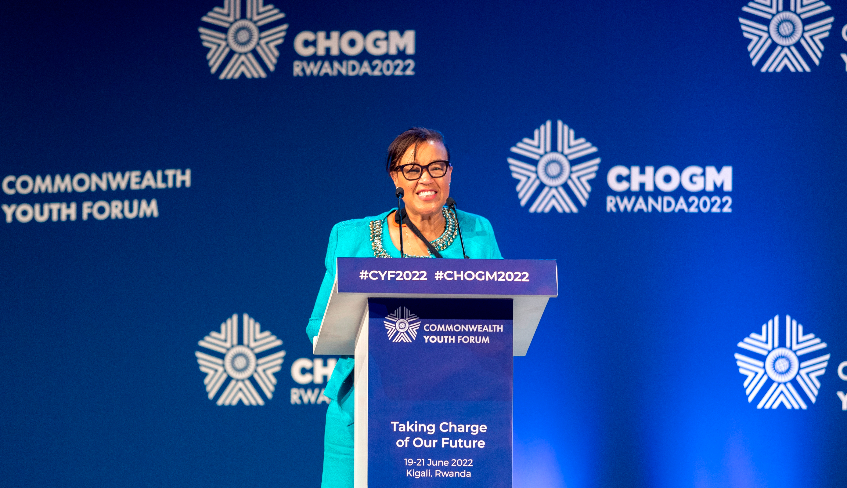 Patricia Scotland QC, the Commonwealth Secretary-General delivers remarks  at the closure of a three-day Commonwealth Youth Forum in Kigali on June 21.She was re-elected as Commonwealth Secretary General. / Courtesy