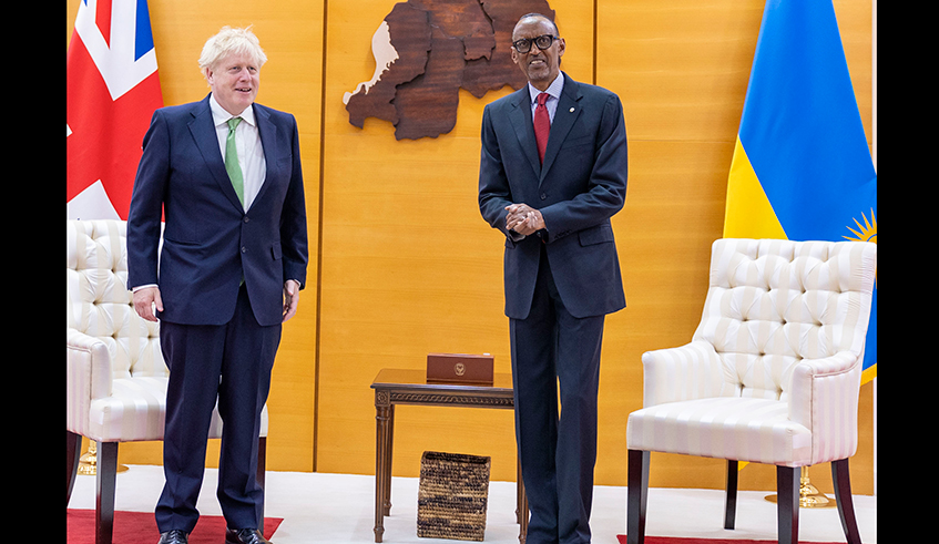 President Paul Kagame receives Boris Johnson, the Prime Minister of the United Kingdom at Village Urugwiro on Thursday, June 23.  The two leaders held talks on existing partnerships between Rwanda and the UK, including the recent Migration and Economic Development partnership. Speaking at the Commonwealth Business Forum, on Thursday, Johnson said intra-Commonwealth trade is set to grow by 50% to $19.5 trillion in the next five years.  / Photo: Village Urugwiro.