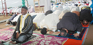 The Mufti, Sheikh Saleh Habimana leading the Eid El Fitr prayer yesterday.  (Photo / J Mbanda).