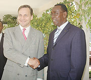 Prime Minister Bernard Makuza and Polish Foreign Minister Radoslaw Sikorski after meeting at the Prime ministeru2019s office yesterday. (Photo J. Mbanda)