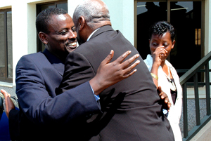 Ntamabyariro (L) and an official from the Advocates Without Borders outside court on Monday. (Photo/J. Mbanda)