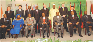 L-R,  FRONT ROW : Malawian President Dr  wa Muthalika, Swazi Deputy Premier Simelane, Presidents Wade (Senegal), Kagame, Compaore (Burkina Faso), Djiboutiu2019s Guelleh and Nkurunziza of Burundi. BACK ROW: European Union Representative J. M Briosa Gala, Genev