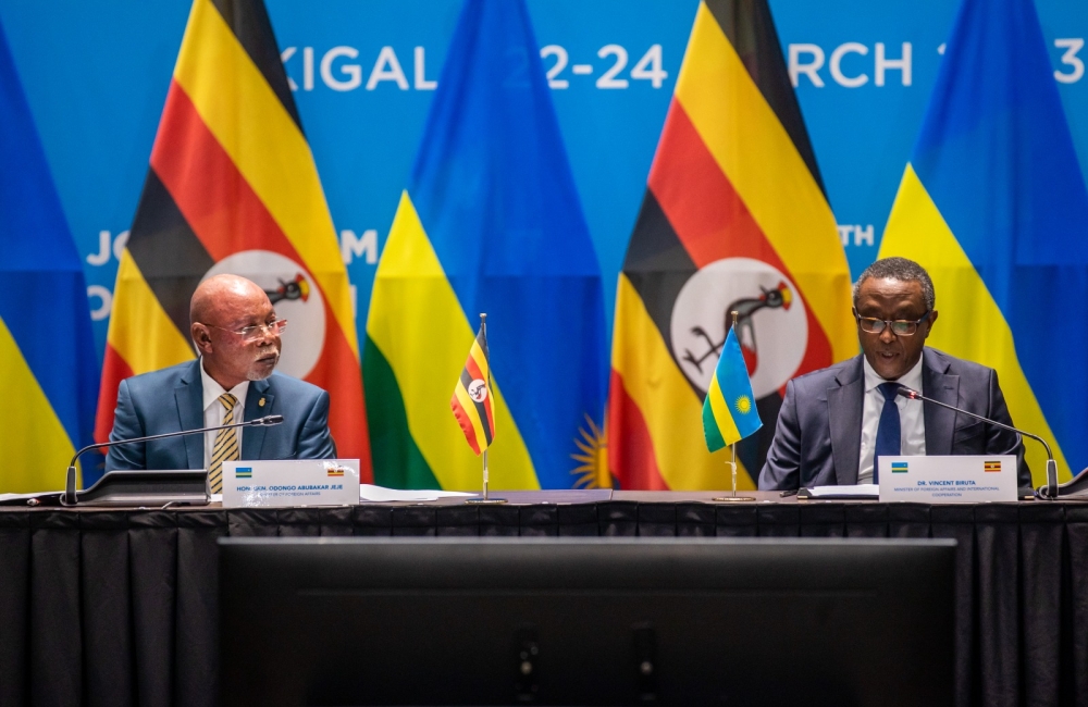 (L-R) Minister of Defence, Juvénal Marizamunda receiving takeover files from the outgoing minister Minister of Defence Maj. Gen Albert Murasira