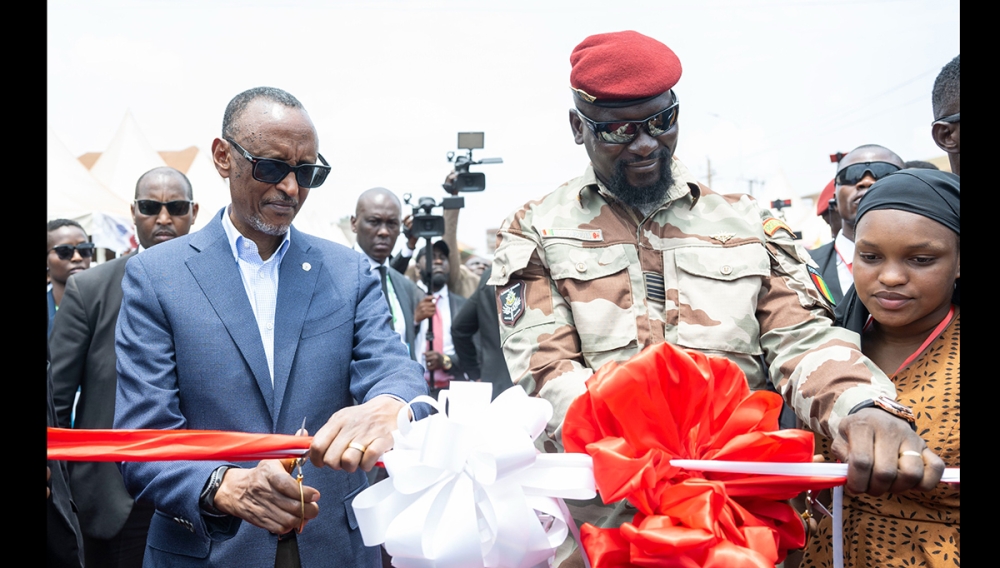 President Kagame and his host Col. Mamadi Doumbouya cutting a ribbon during the inauguration of the highway interchange.Photos: VIllage Urugwiro