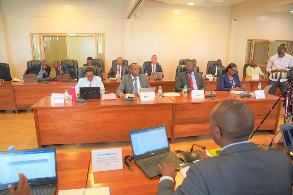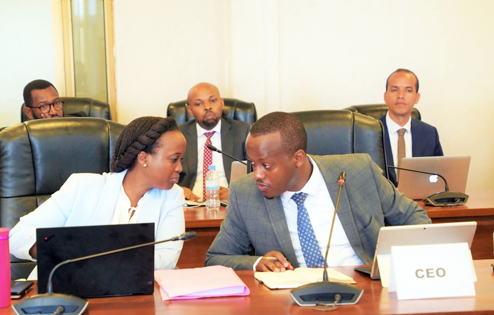 Rwanda Social Security Board’s Chief Executive Regis Rugemanshuro (right) consults with his deputy Louise Kanyonga, during the public hearing before the Parliamentary Public Accounts Committee in Kigali on Monday, September 5. Rugemanshuro told the committee that there are changes being done to ensure financial efficiency.  Photo: Craish Bahizi.