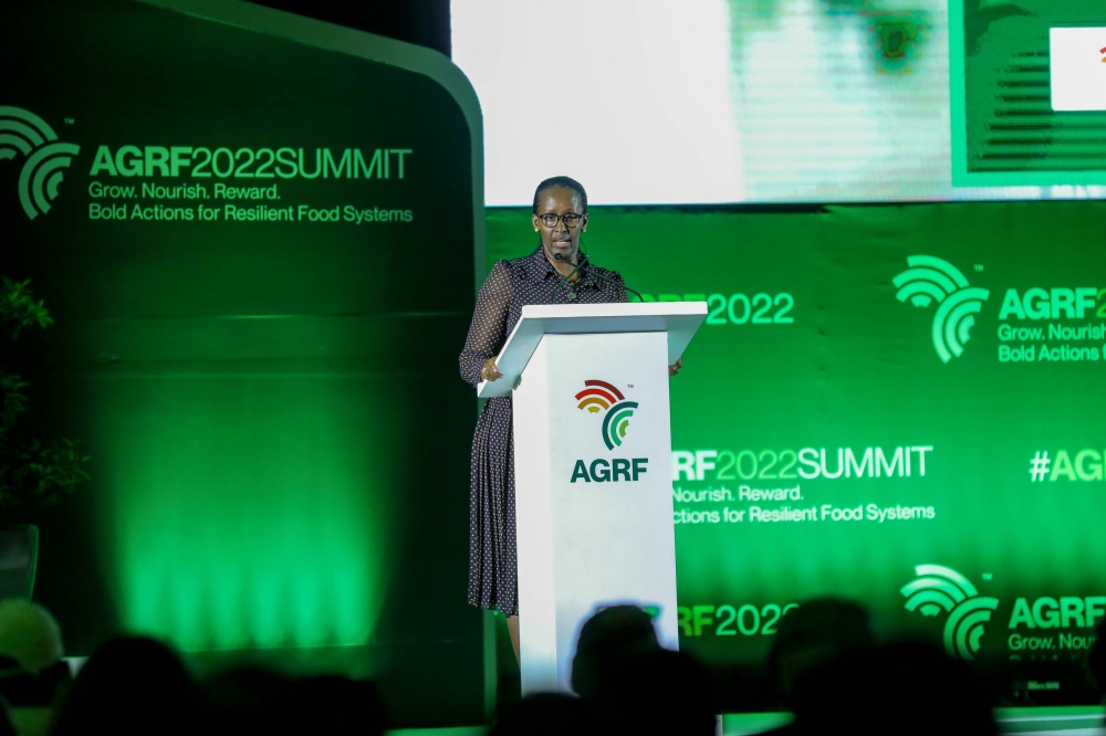 First Lady Jeannette Kagame delivers remarks during  the ongoing 12th Africa Green Revolution Forum  in Kigali on September 7. Photo by Dan Nsengiyumva