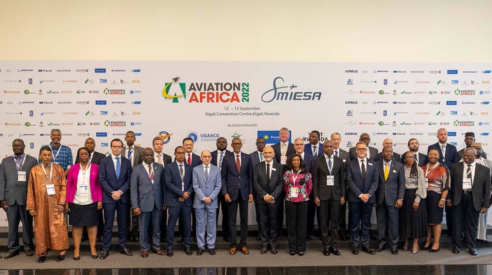 President Paul Kagame with senior delegates at the 6th Aviation Africa Summit and Exhibition that kicked off  in Kigali on September 12. While addressing  the two-day summit that has brought together over 100 global aviation companies, Kagame said that  the liberalisation of air transport in Africa can act as a catalyst to speed up the industry’s recovery by increasing connectivity, stimulating demand, and creating jobs. Photo by Village Urugwiro