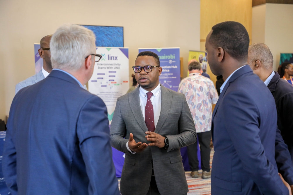 Yves Iradukunda, the Permanent Secretary in the Ministry of ICT and Innovation (centre), interacts with delegates at the African Peering and Interconnection Forum 2022 in Kigali on Wednesday, August 24. Photo: Dan Nsengiyumva.