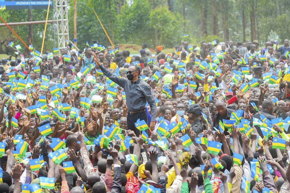 President Kagame greets thousands of Nyamasheke residents at Kagano ground for the third day of Citizen outreach on August 27.  Photo by Village Urugwiro