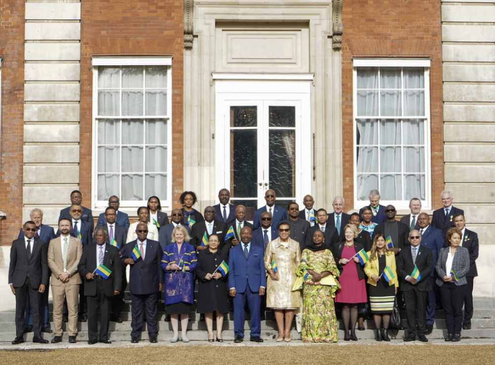 Officials pose for a group photo as Gabon’s flag raised to mark entry into the Commonwealth