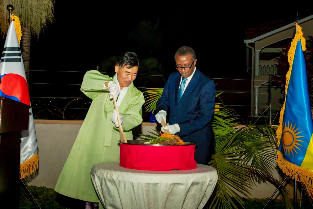 Ambassador Chae and Minister Biruta mixed the ingredients together to make a bibimbap, a popular traditional Korean dish at  the celebration of the National Foundation Day in Kigali. Courtesy