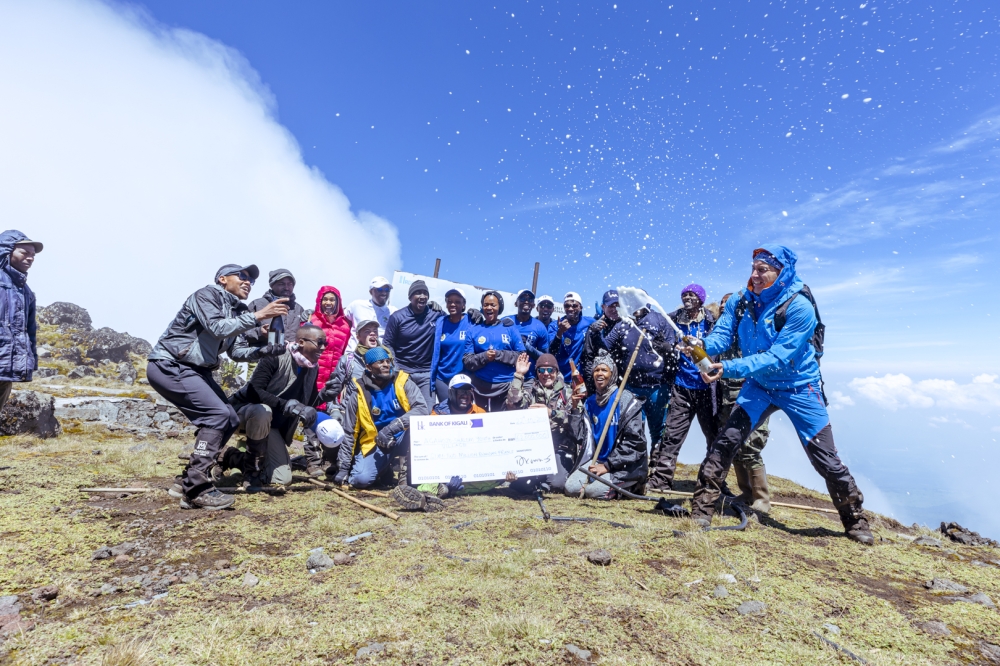 Employees of Bank of Kigali and Agahozo Shalom Youth Village celebrate after hiking Mount Karisimbi for  a Rwf62 million fundraising campaign last week. Courtesy