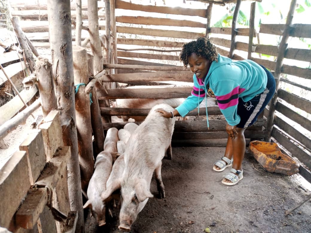 Umutoniwase, works in her pig farm in Kigeme Refugee Camp  in Nyamagabe District of Rwanda.
