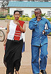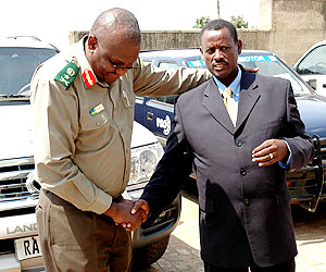 Mrs Kagame receives a gift from the Executive Secretary of Kicukiro Sector, Marie Rose Nirera, yesterday. (Photo/G. Barya)