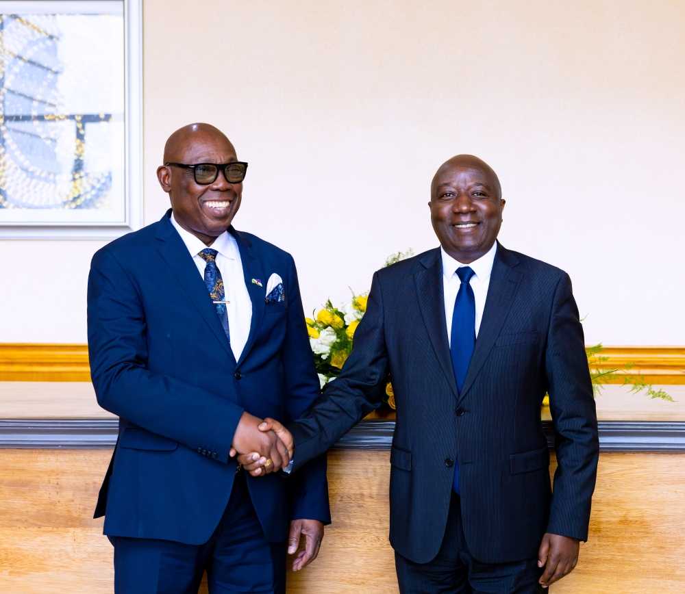 Minister of Justice Emmanuel Ugirashebuja and Namibia’s Deputy Chief Justice, Petrus T. Damaseb during a meeting in Kigali. Courtesy