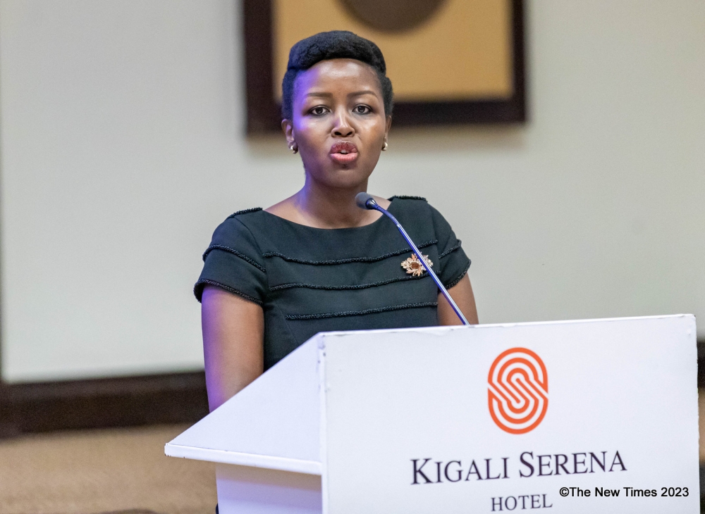Minister of Finance Uzziel Ndagijimana delivers remarks during the conference at the Kigali Marriott Hotel on March 28