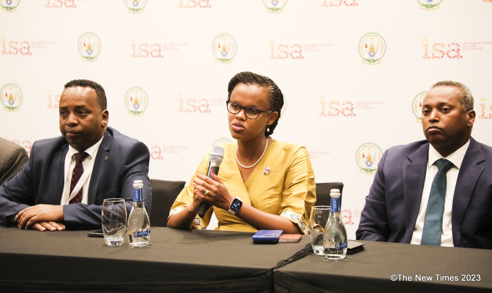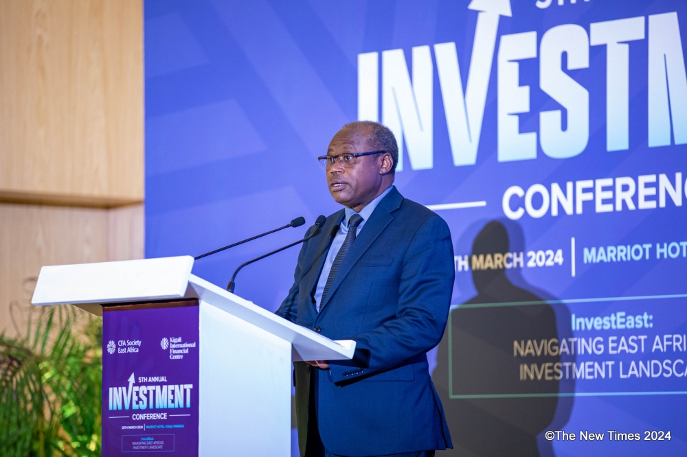 Minister of Finance Uzziel Ndagijimana delivers remarks during the conference at the Kigali Marriott Hotel on March 28