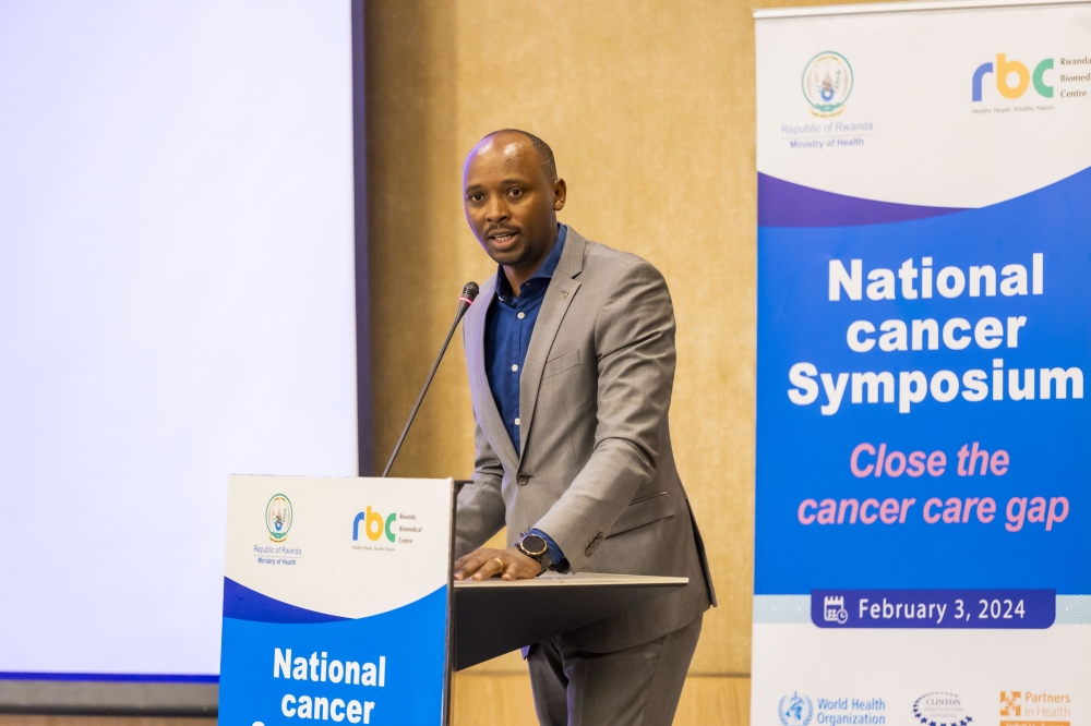 Dr Sabin Nsanzimana, the Minister of Health delivers remarks during national cancer symposium on February 3, in Kigali ahead of  World Cancer Day that is observed on February 4. Courtesy