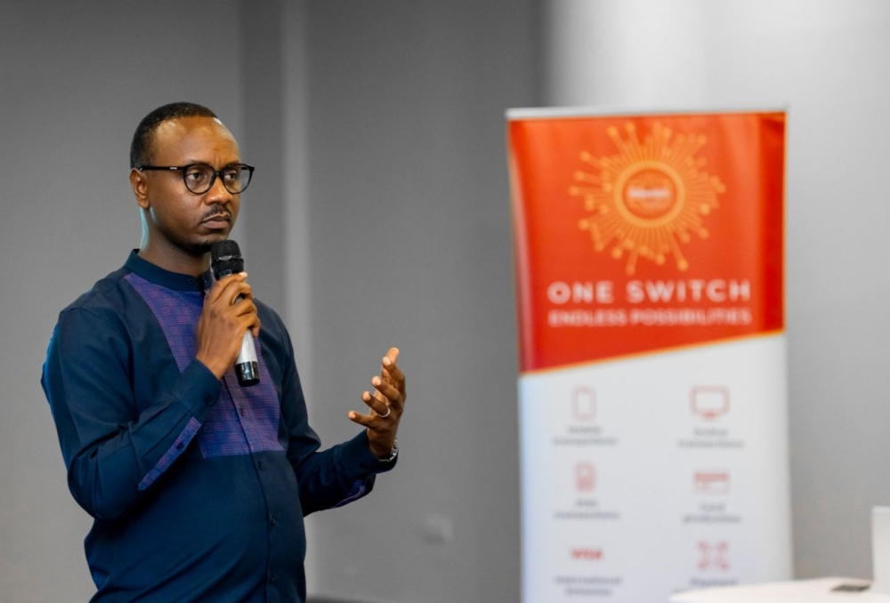 Jean-Jacques Sereme Kajuga, Chief Operating Officer of RSwitch, speaking to fintech industry players about RNDPS eKash on February 16. Courtesy photo