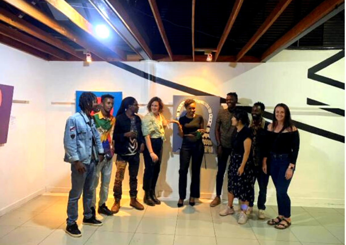 Myriam Uwiragiye Birara with different people who attended the opening of her exhibition