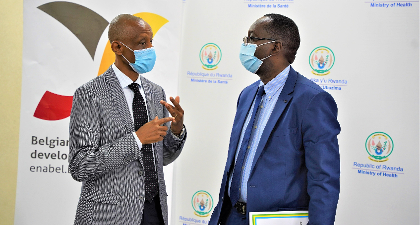 Minister for Health  Dr Daniel Ngamije interacts with Emile Bienvenue, the Director-General of Rwanda Food and Drugs Authority in a recent event. The ministry bans advertisement of medicines, medical services.