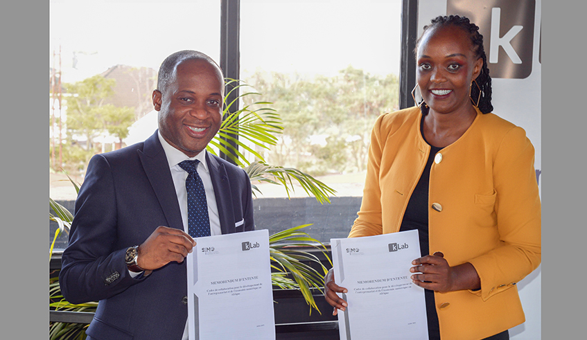 Yannick Ebibie Nze, Director General of Societe Du2019Incubation Numeu0301rique du Gabon (SING) and Yeetah Kamikazi, General Manager of kLab after signing the MoU