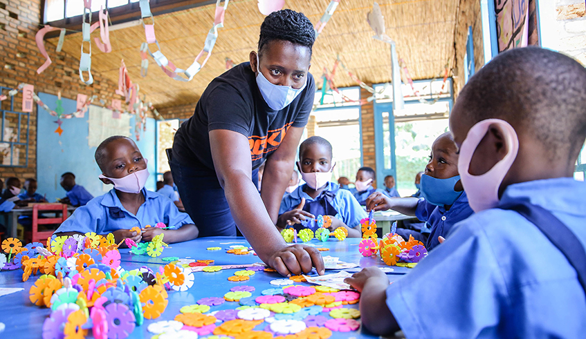A teacher helps young pupils during a drawing lesson at Nyarugunga Early Childhood Development Centre in Kicukiro District on June 28, 2021. / Photo: Dan Nsengiyumva.