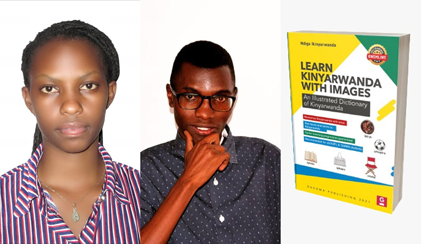 Nancy Umuhire, Principe Tuyishime and a cover of their published Kinyarwanda dictionary. / Courtesy photos.