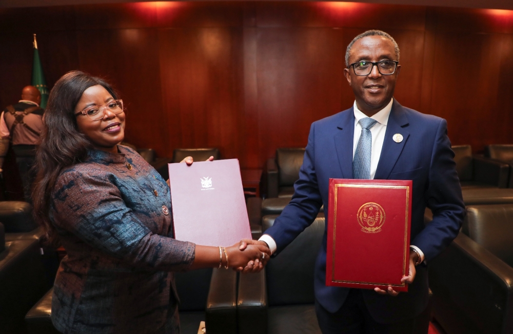 The Minister of Finance and Economic Planning, Uzziel Ndagijimana, and the Ag. Director General of Kuwait Fund for Arab Economic Development, Waleed Al-Bahar, during the signing of a concessional $20 million (about Rwf 26 billion) loan agreement on the sidelines of the African Development Bank Annual Meeting in Nairobi, Kenya, on Thursday, May 30. The funds will go toward rehabilitation of Muhanga-Nyange road. Courtesy.