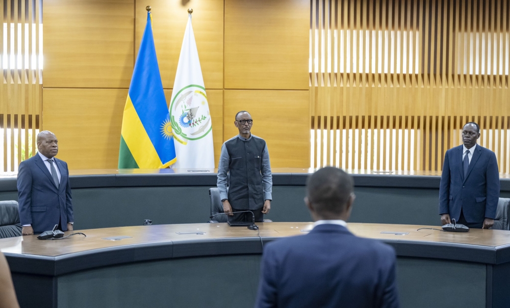 (L-R) The new envoys :  Ambassador Eric William Kneedler of the USA, High Commissioner Andrew Onalenna Sesinyi of the Republic of Botswana, Amb Joan Jacobje Jantina Wiegman of the Kingdom of the Netherlands, Ambassador Nicol Adamcová of the Czech Republic, Ambassador Jorge Moragas Sánchez of the Kingdom of Spain, High Commissioner Maj. Gen. Ramson Godwin Mwaisaka of the United Republic of Tanzania and High Commissioner Ruzaimi bin Mohamad of Malaysia. Photos by Village Urugwiro