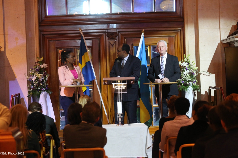 The CEO of Agaciro Development Fund, Gilbert Nyatanyi, with the Group Executive Corporate Affairs and Investor Relations of TDB, Mary Kamari, during the announcement of the fund’s $8.1 million investment in the regional bank. PHOTO BY IGIHE