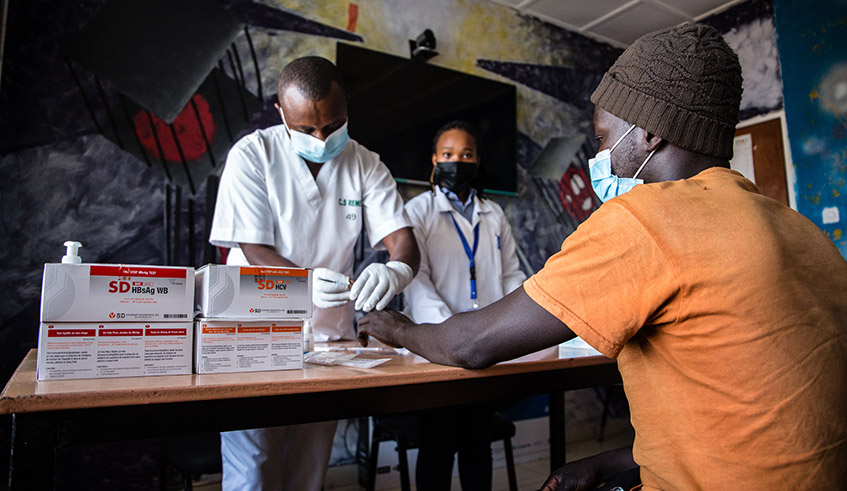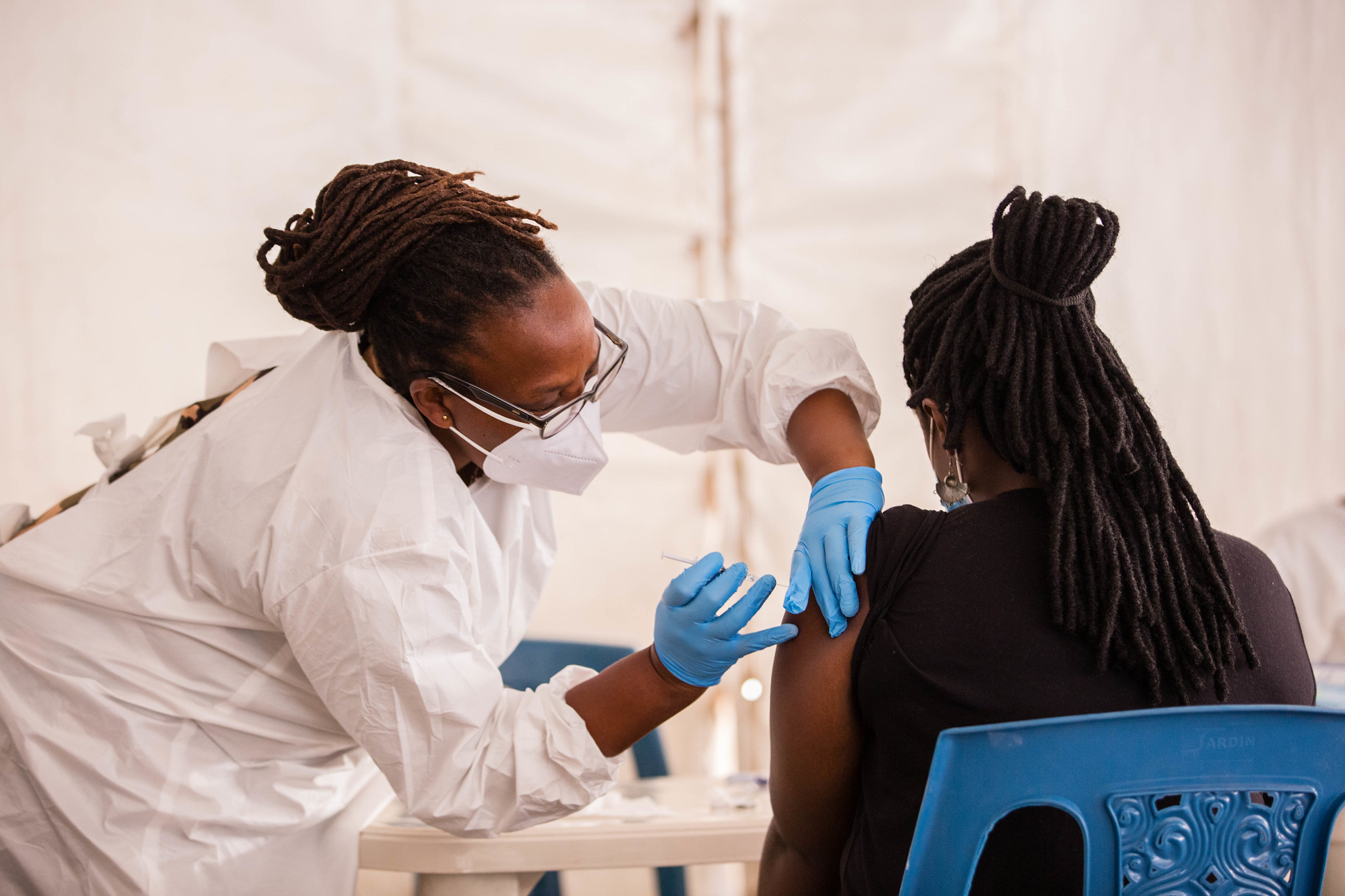 A health worker administers a Covid-19 jab at Kimironko Taxi Park during a newly rolled out vaccination campaign in the City of Kigali on Tuesday, November 16. Adults in the city who missed out on Covid-19 vaccination can now receive their first or second dose. / Photos: Craish Bahizi.