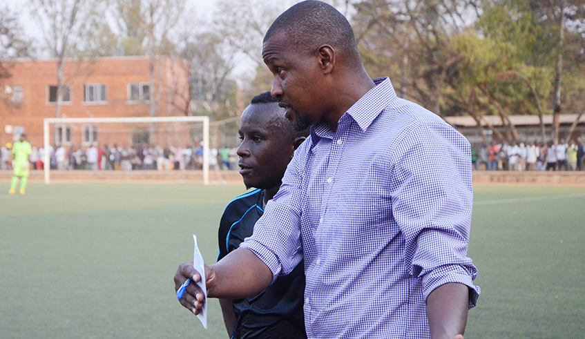 APR VB Club head coach Elie Mutabazi gives instructions to his players during a past league match. The Rwandan champions has received all-clear to start training ahead of the 2021 African Club Championship. /Sam Ngendahimana