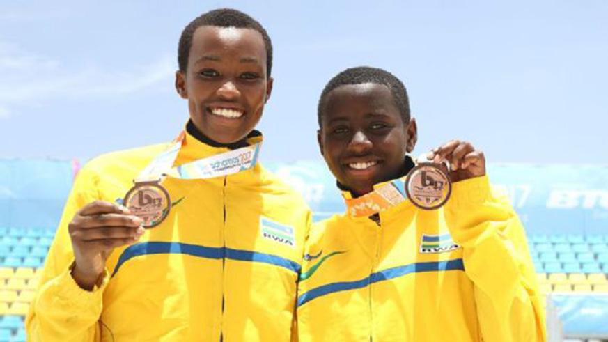 Olivier Ntagengwa (L) and Patrick Kavalo Akumuntu won bronze at this yearu2019s All-Africa Games in menu2019s beach volleyball in September. Courtesy.