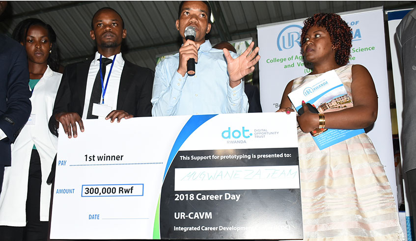 Mugwaneza (2nd left) with a dummy cheque for the cash prize he won after his sweet potato processing project was selected the best in a university competition last year. / Courtesy photos