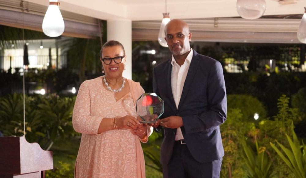 Commonwealth Secretary-General, Patricia Scotland KC hands over the award to Justice Minister Emmanuel Ugirashebuja during the 2024 Commonwealth Law Ministers Meeting in Zanzibar on Wednesday, March 7. Courtesy