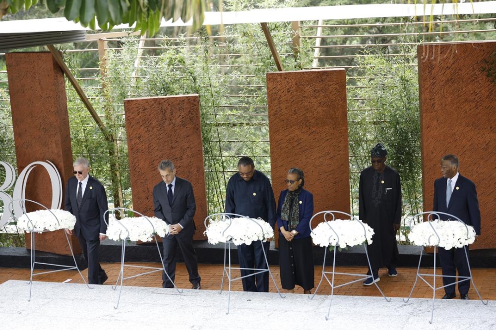 Former heads of state and government observe a moment of silence to pay tribute to victims at Kigali Genocide Memorial on April 7. Photo by  Olivier Mugwiza