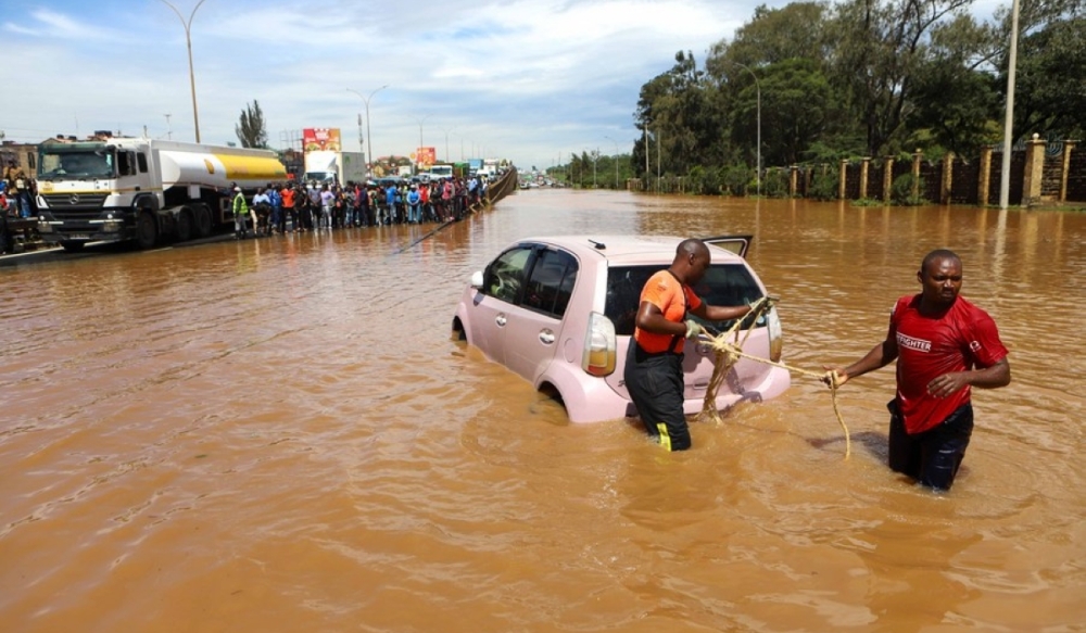 People pull a car submerged in flood water along Thika Road in Nairobi, capital of Kenya, on May 1, 2024. (Photo by Joy Nabukewa. Xinhua)