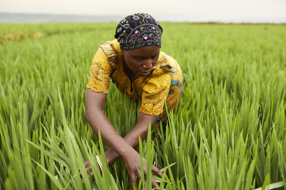 A farmer works in her rice plantation in Bugesera District through  the Bugesera Agricultural Development Support Project (PADAB).