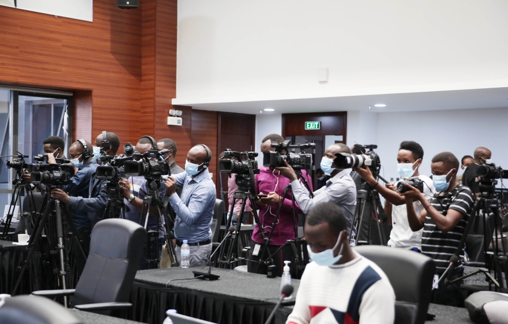 Chief Justice Domitilla Mukantaganzwa (C) addresses the media during the launch of Justice Week in Kigali on Monday, December 8. Courtesy.