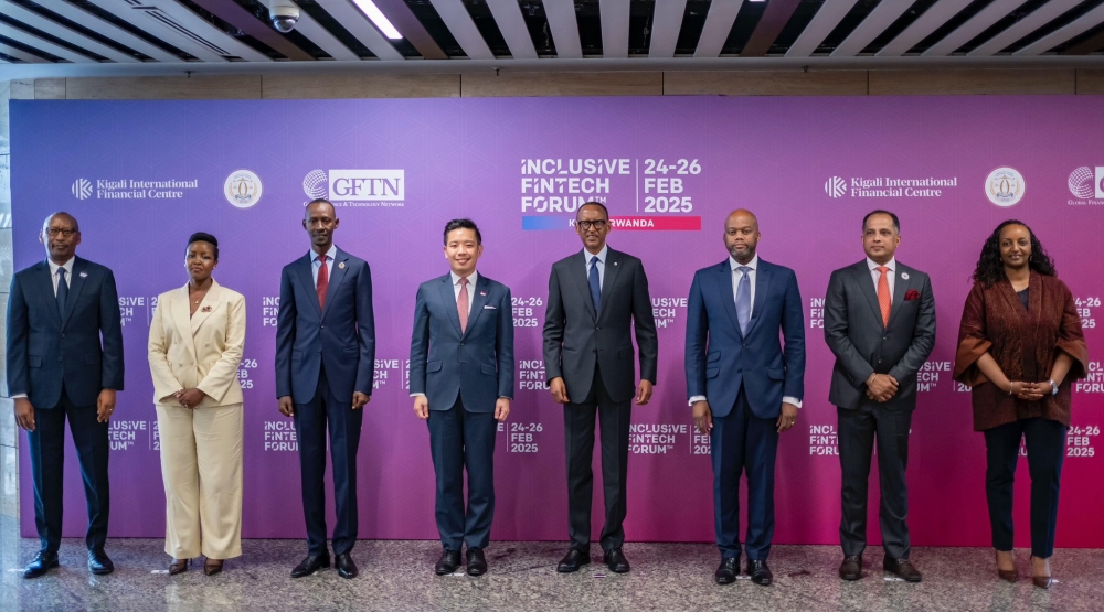 Participants pose for a group photo after completing the Anti-GBV Car-Free Day walk from BK Arena to the Kigali Convention Centre. Photo by Craish Bahizi