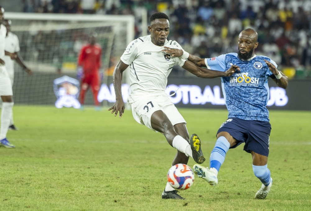 Police FC (Left) striker Elijah Ani shields the ball from Amagaju midfielder Emmanuel Tuyishime during the match.