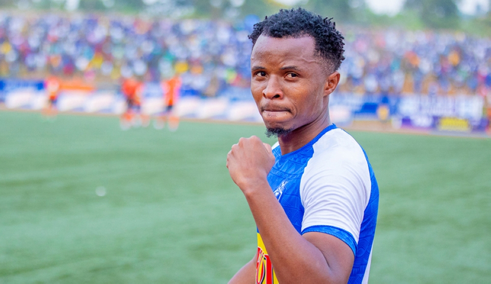 Ugandan attacker Emmanuel Okwi celebrates after giving AS Kigali the lead in their 2-0 win over Vision on Monday at Kigali Pele Stadium-courtesy
