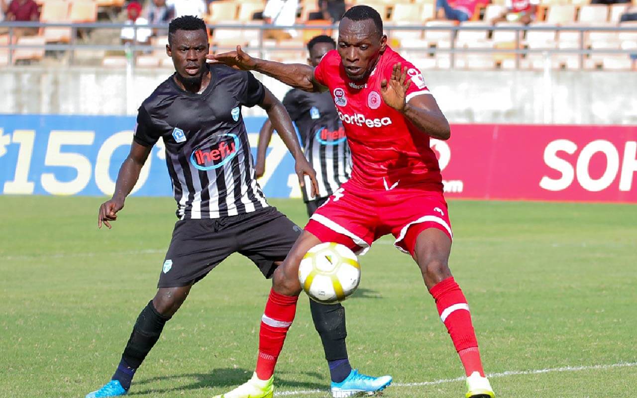 Police FC Nigerian midfielder Djibrine Akuki Abubakar (in Blue jersey) battles for the ball against Mukura's player. Akuki is sure his country will defeat South Africa in the AFCON 2023 semi finals. Courtesy
