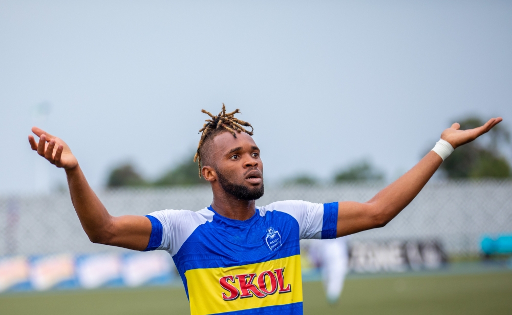Rayon striker Charles Bbaale celebrates after scoring the opener against Gasogi