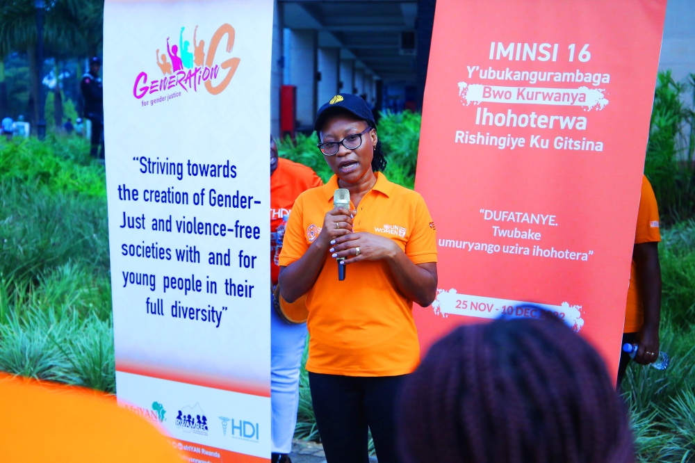 Minister of Gender and Family Planning Bayisenge addresses the participants at an anti-GBV awareness campaign on Sunday, December 4. Photo by Craish Bahizi