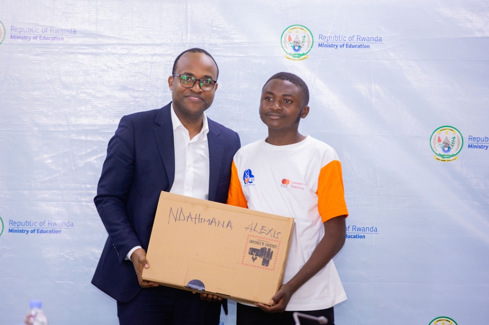 Gaspard Twagirayezu, the State Minister in charge of Primary and Secondary Education  awards best performer Alexis Ndahimana from ES Kirinda on Thursday, December 15.  Courtesy